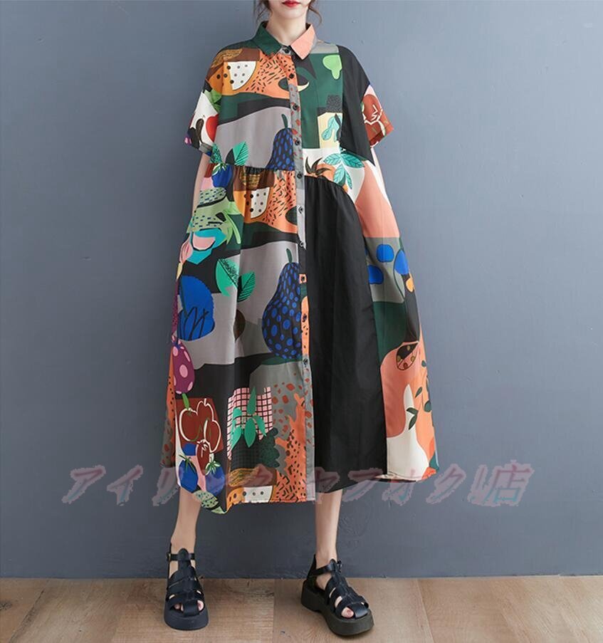 - ☆新品上品 シャツワンピース 半袖 ロング丈 ワンピース きれいめ プリント柄 森ガール ミモレ丈 大人 着痩せ ブラック