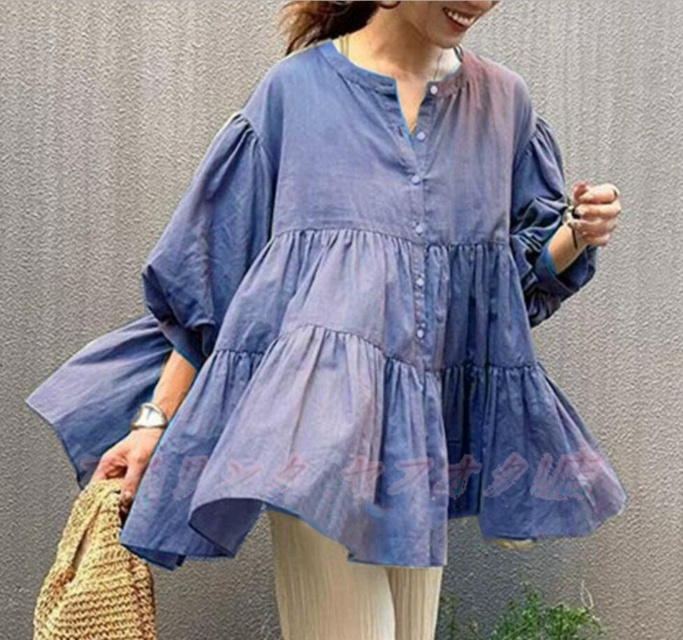 - ☆新品ゆったり フレア ブラウス 半袖 オーバーサイズ レディース チュニック きれいめ オフィス 無地 トップス ブルー