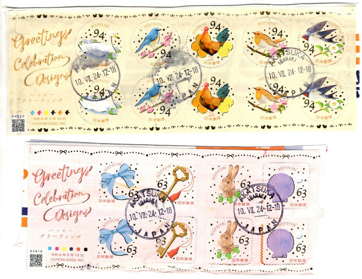 > ハッピーグリーティング 令和6年春 94円10枚ペーンと63円ペーンのうち8枚(2枚はカット) 欧文印実逓 使用済 記念 切手