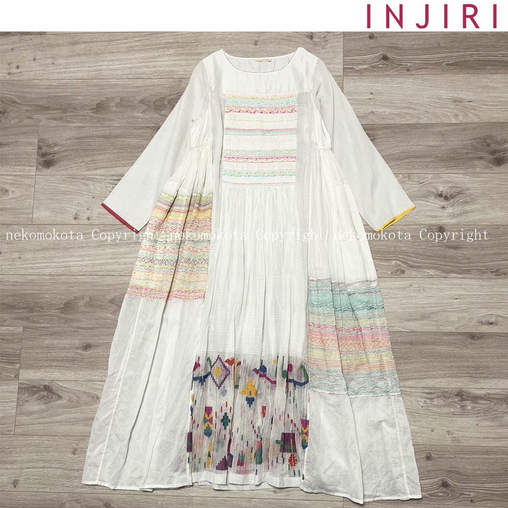 > 美品 インジリ 生地感たっぷり ミシンステッチ ジャムダム織り パッチワーク ロング ワンピース サイドギャザー 刺繍 S ホワイト 白 injiri