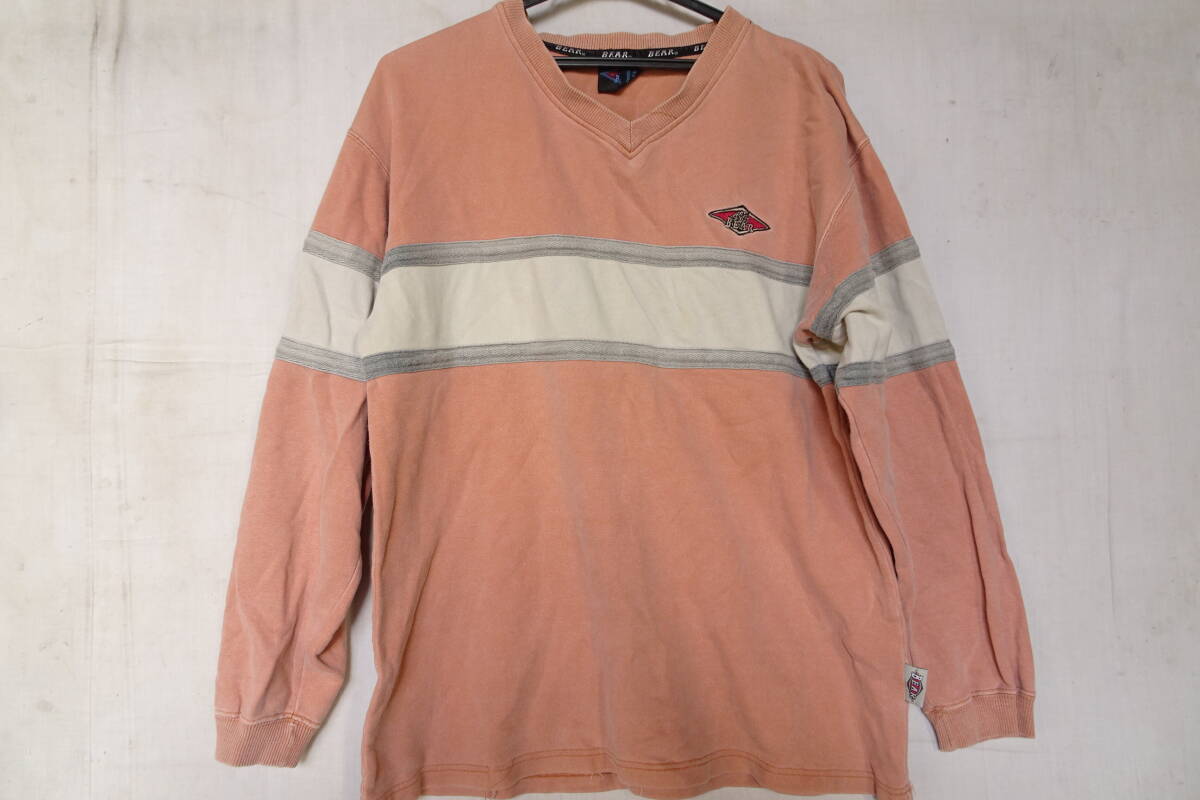 - BEAR/ベアー/長袖トレーナー/スウェット素材/Vネック/胸・袖白切替/グレーラインテープ/くすみピンク/スモーキーピンク/Mサイズ(10/31R6)