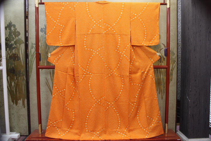 > きもの今昔7713 総絞り小紋きもの 広衿袷手縫い仕立 高級正絹綸子地4つ巻き小絞に小帽子絞りの色差し入り 身丈155cm
