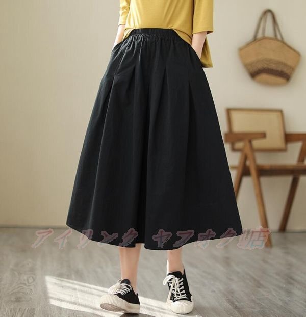 > ☆新品Fサイズ ひざ丈スカート 綿麻 レディース ボトムス カジュアル ゆったり 膝丈 ミモレ丈 フレアスカート 黒