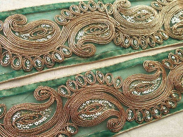 - 即決 !0.5mより インド刺繍テープ スパンコールチロリアンテープ緑☆カルトナージュ☆ハンドメイド☆手芸用品 リボン インドサリー
