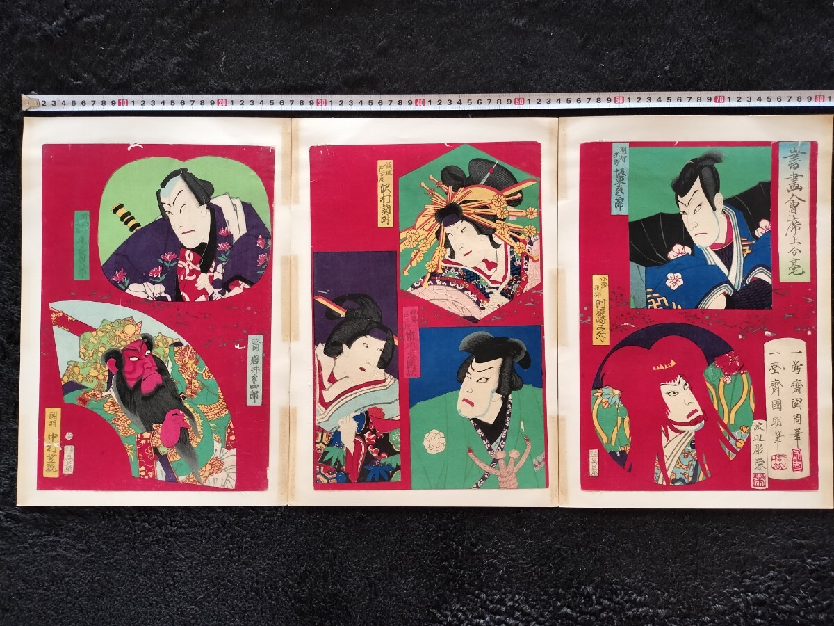 - 明治期/真作 豊原国周 歌川国明「書画会席上分毫 明智光秀 関羽」本物浮世絵木版画 歌舞伎絵 役者絵 芝居絵 錦絵 大判 三枚続き 裏打ち