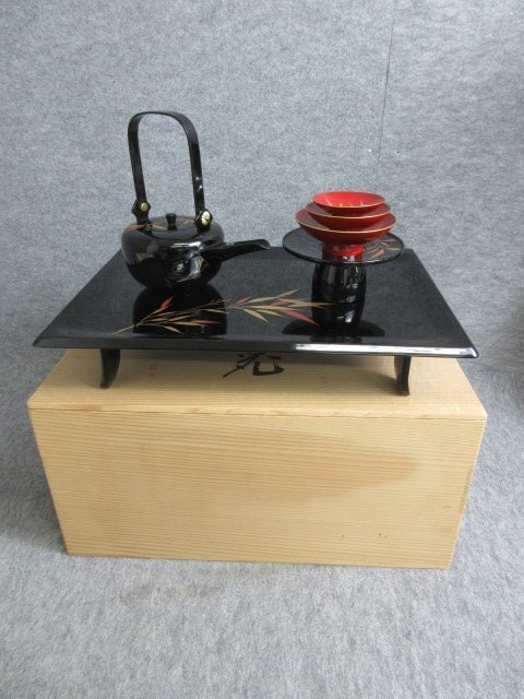 - 黒塗 蒔絵 屠蘇器 揃え 共箱付き [B27777] 酒注ぎの高さ20cm 直径12cm 盃台の高さ6cm 直径13.5cm とそ器 セット 木箱 祝 結婚 神事