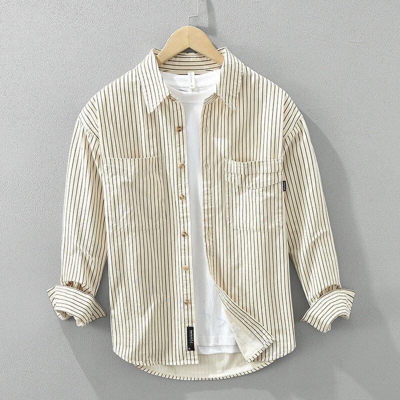 > ☆新品 長袖シャツ ストライプ シャツジャケット 春秋服 メンズ トップス カジュアルシャツ 杏色 3XL選択