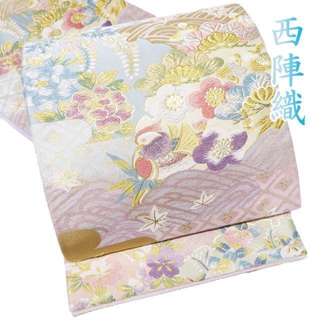 - 袋帯 中古 リサイクル 正絹 フォーマル 仕立て上がり 六通 西陣織 ラベル 花と鴛鴦の図 金通し 多色 金銀 きもの北條 A1112-14