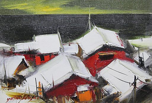 - ■☆葛西四雄■示現会 日展 【雪の屋根】 油彩 4号 直筆サイン 真作保証有り