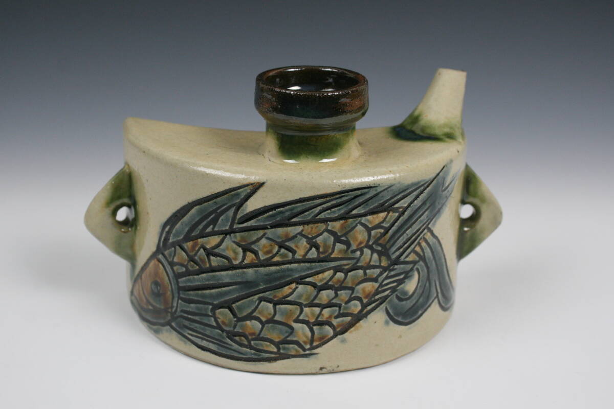 - 壺屋焼 人間国宝 金城次郎 作 魚文抱瓶(小)