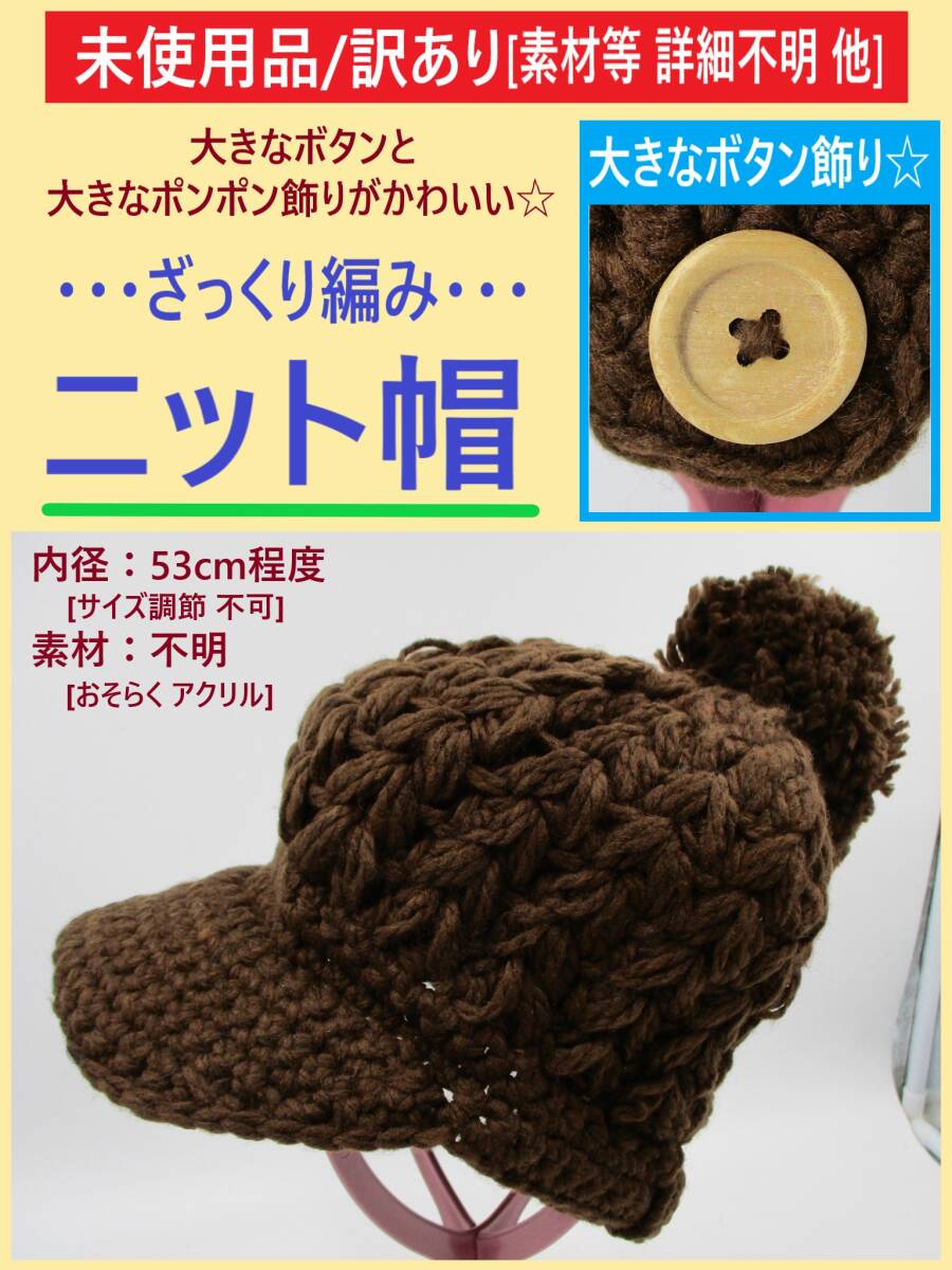 > 訳あり 未使用 ざっくり編み ボタン付き ニット帽 ブラウン A 長期保存 ツバ付き 大きな ポンポン 茶 男女兼用 内径約53cm 詳細不明 海外製