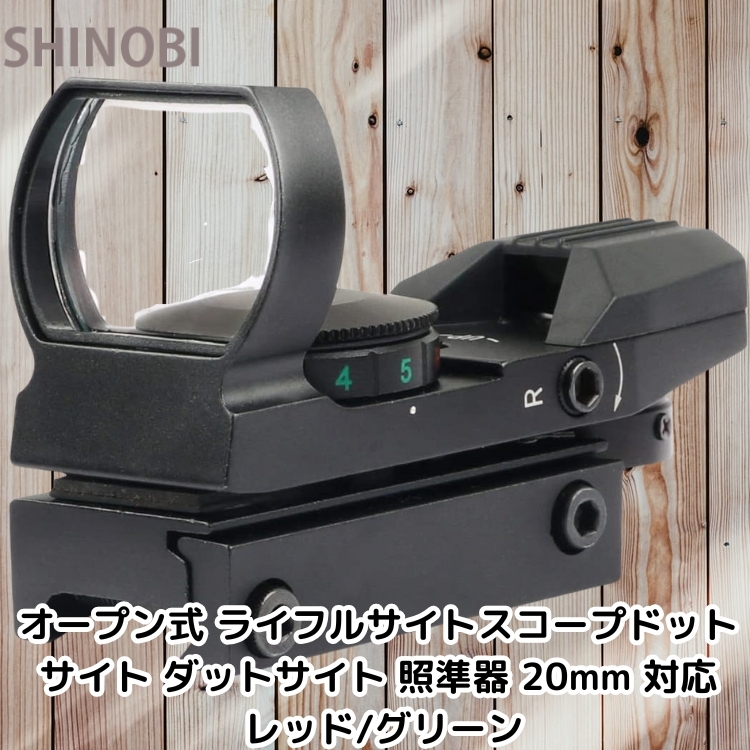 - オープン式 ライフルサイトスコープドットサイト ダットサイト 照準器 20mm 対応 110グラム レティクル形状4タイプ 色(赤/緑) 2色