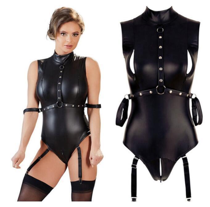 - 新作 上質超セクシー 黒 光沢 ボンテージ フェイクレザー ボンテージ レオタード 女王様 /ガーター付きハイレグレオタードYWQ1695