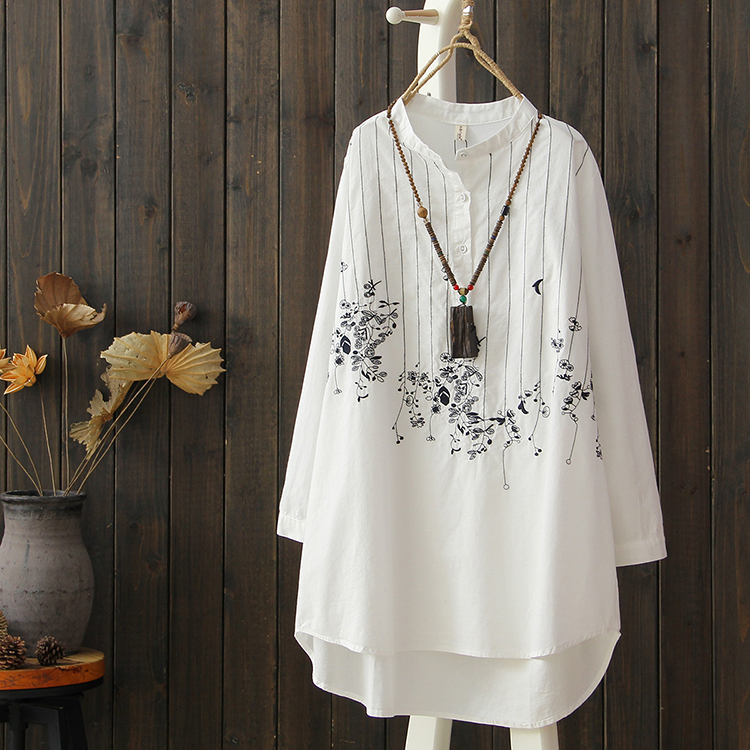- 襟花刺繍 中長 シャツ 女性2020春秋 ゆったり 着やせ 長袖 ブラウス 白YWQ654