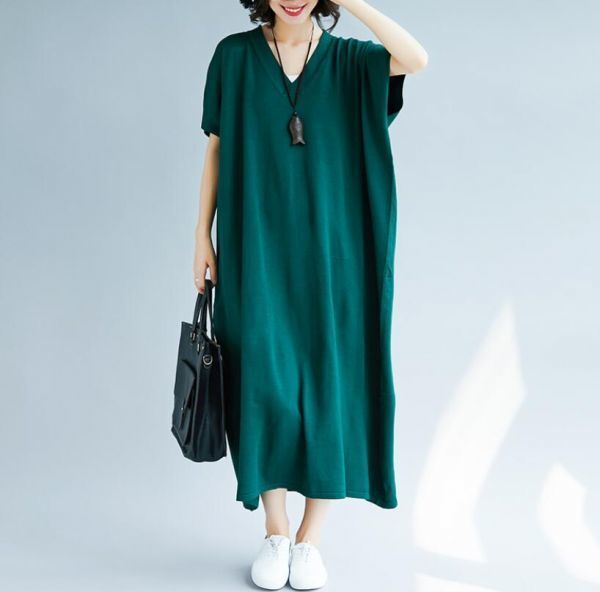 - 2021新品 ナチュラル ゆったり 素敵な 無地 体型カバー 大きいサイズ 半袖 ルーズニットロング丈ワンピースYWQ445