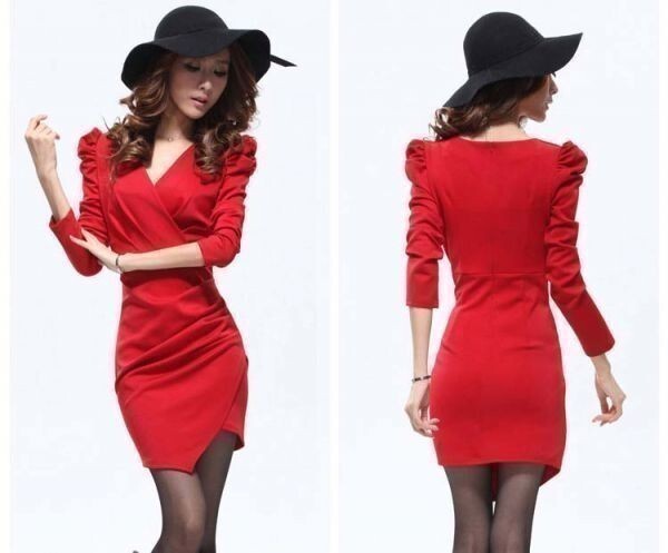 - ワンピース 長袖 ミニ M 赤 Vネック カシュクール パフ袖 タイト ギャザー スリム 新品 YLH223