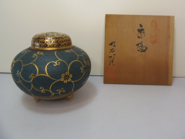 - k304 【九谷焼 竹隆】 香炉 青粒鉄仙 ※難有(蓋内側小さな凹み傷有)