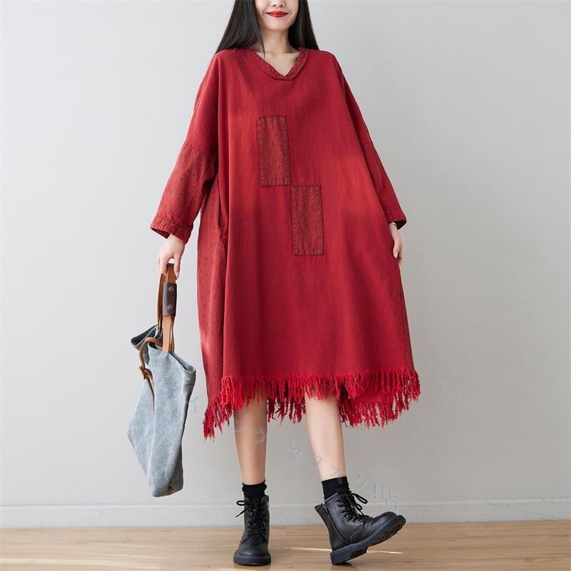 - ☆新品ワンピース Vネック トレーナー タッセル 洋服ミックス アンティーク風 ロマンファッション 綿100% ゆったり レッド