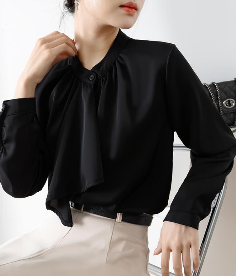- 秋冬/上品 ボウタイブラウス レディース シャツ トップス 長袖 オフィス カジュアル 大人 シフォン シャツ OL 通勤 ブラウス / 黒