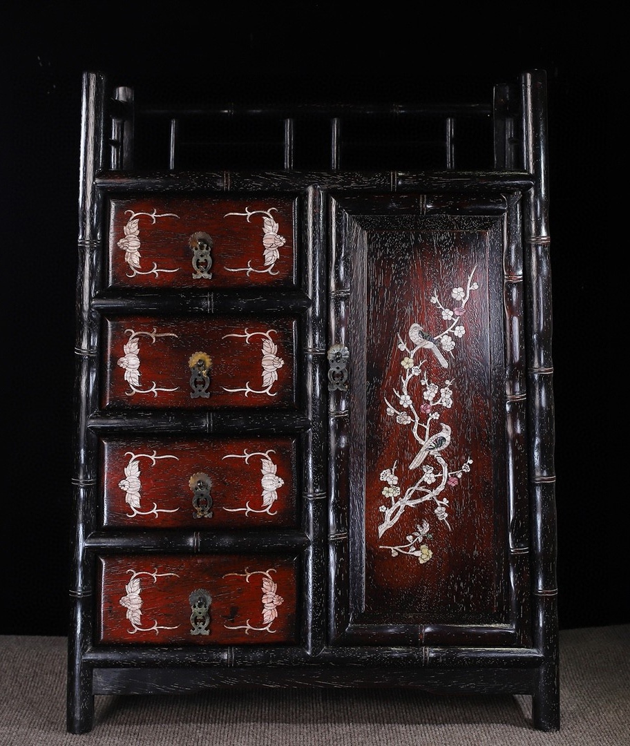 - *珍品旧蔵* 清代 紫檀木 貝殼 四抽一開門竹節 茶櫃 餐邊櫃 收納櫃 純手彫り 希少珍品 Y1120