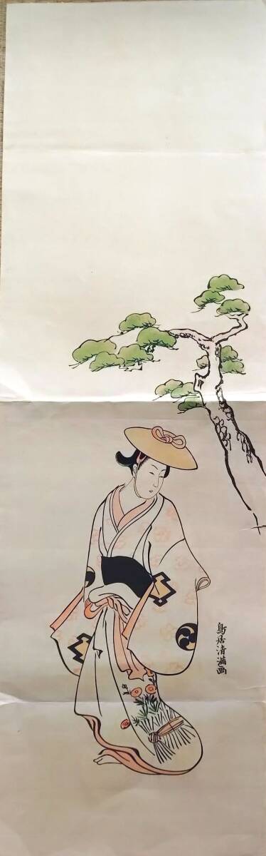 - f24112232〇彩色木版画 縦長 木の下の日本女性 鳥居清満 大正時代〇和本古書古文書