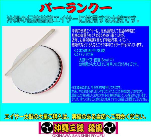 - 沖縄伝統芸能エイサー太鼓 パーランクー 18cm中サイズ バチ付 新品未使用