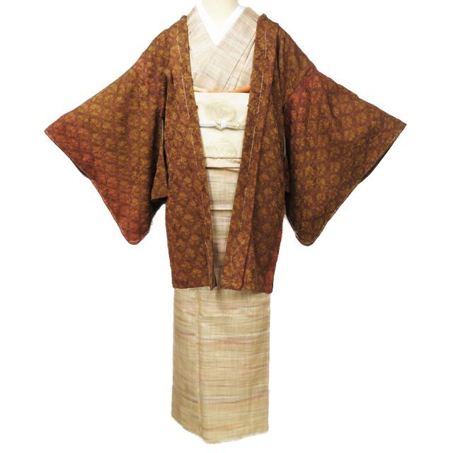 - 羽織 コート 着物 正絹 中古 絞り染め 暈し 地模様 土色 多色 身丈82cm 裄64cm きもの北條 A1118-4