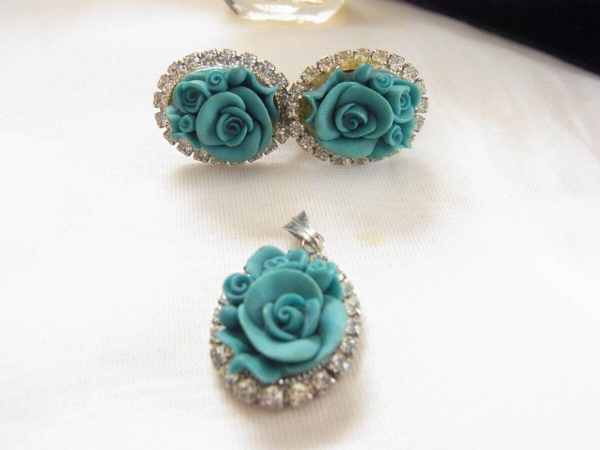 > ★ビンテージ/ヴィンテージ お得なセット クリアラインストーンがもえぎ色グリーントーンのお花を囲む ペンダントトップとイヤリング