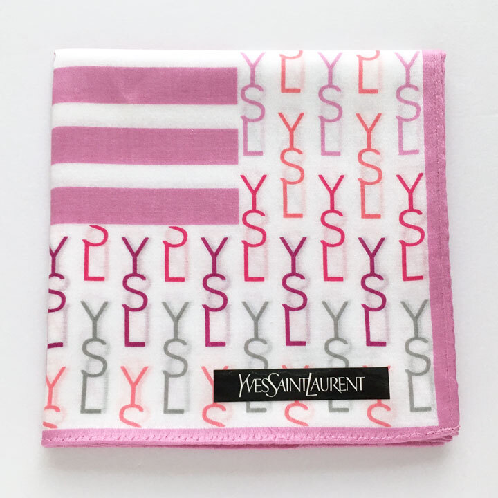 - サンローラン / YvesSaintLaurent ハンカチ ピンクボーダー&YSLロゴ柄 白生地 ピンクふち【6313】