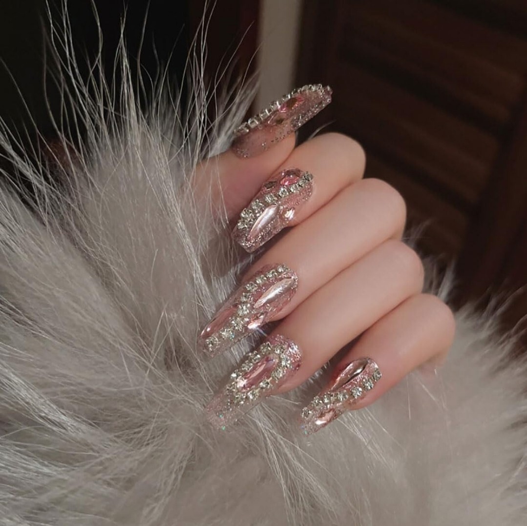 > M-141@26枚入り ネイルチップ ヌードピンクのラインストーンビジュー しい大人女性のネイル ネイルパーツ