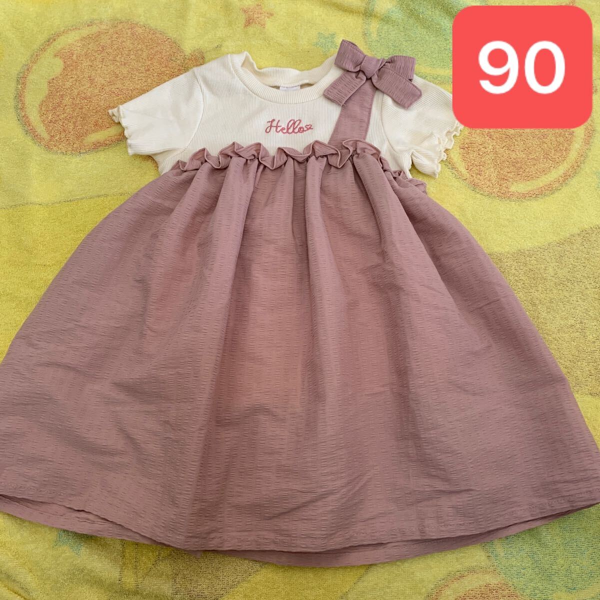 - ロリータ 刺繍 リブ くすみピンク リボン 半袖 ワンピース チュニック 90