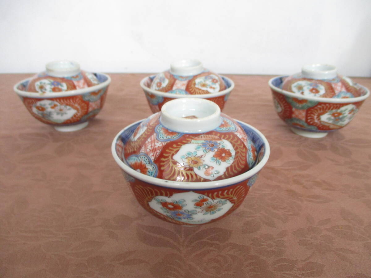 - ★古い蓋つきお碗 4客 径10.5cm 高さ7.5㎝(蓋して) ※汚れキ・窯キズ等あり tm2411-28-1★