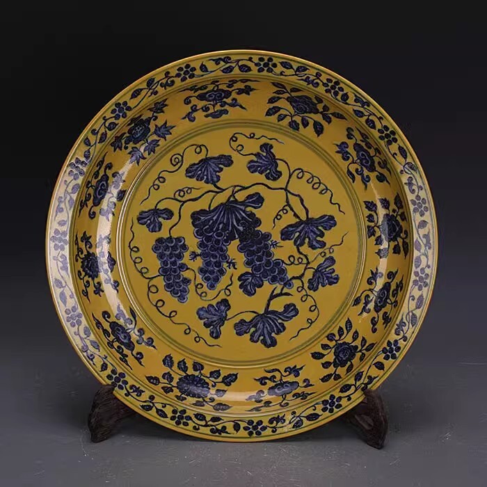 - ◆旧家蔵出◆ 古美術 中国古玩 大明宣徳年製款 青花 黄釉 葡萄紋大盤 擺件 古賞物 骨董 時代物 CN01