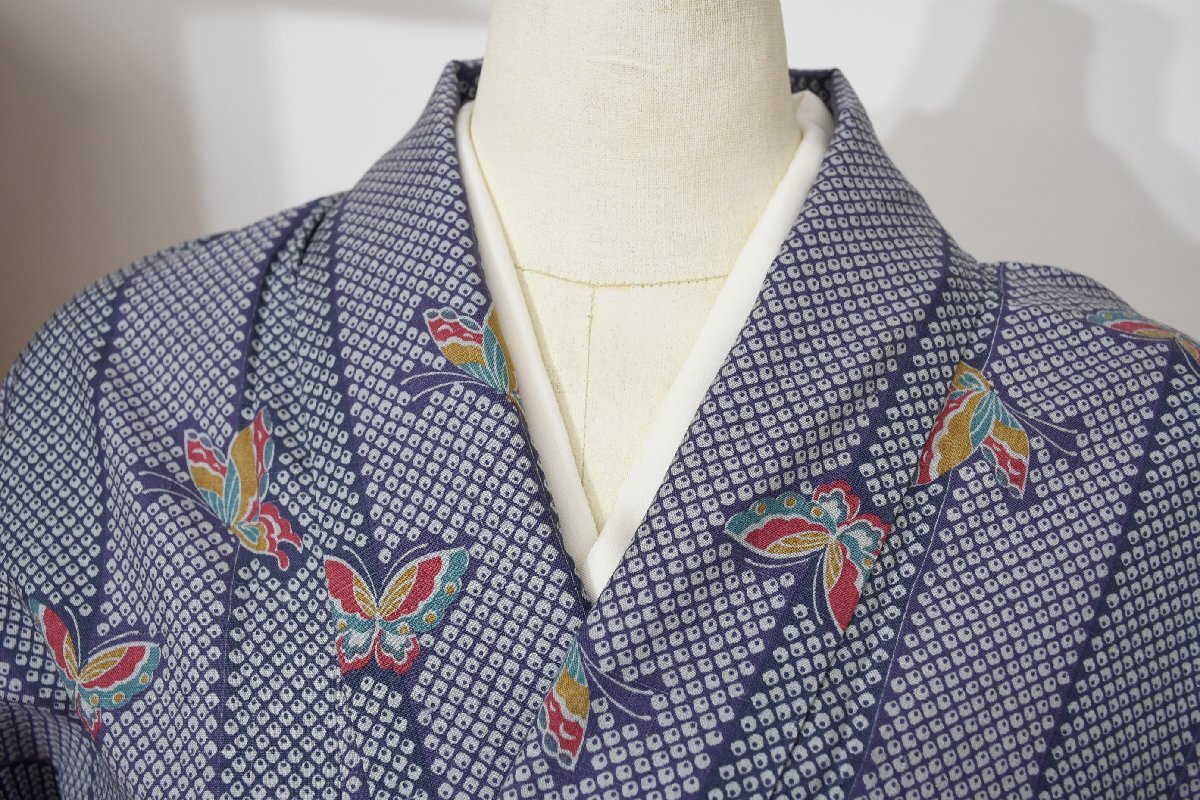 - 小紋 着物 袷 縞帳 蝶々 紬地 身丈150cm 裄丈63.5cm ★ kb-6241 桜庭呉服店