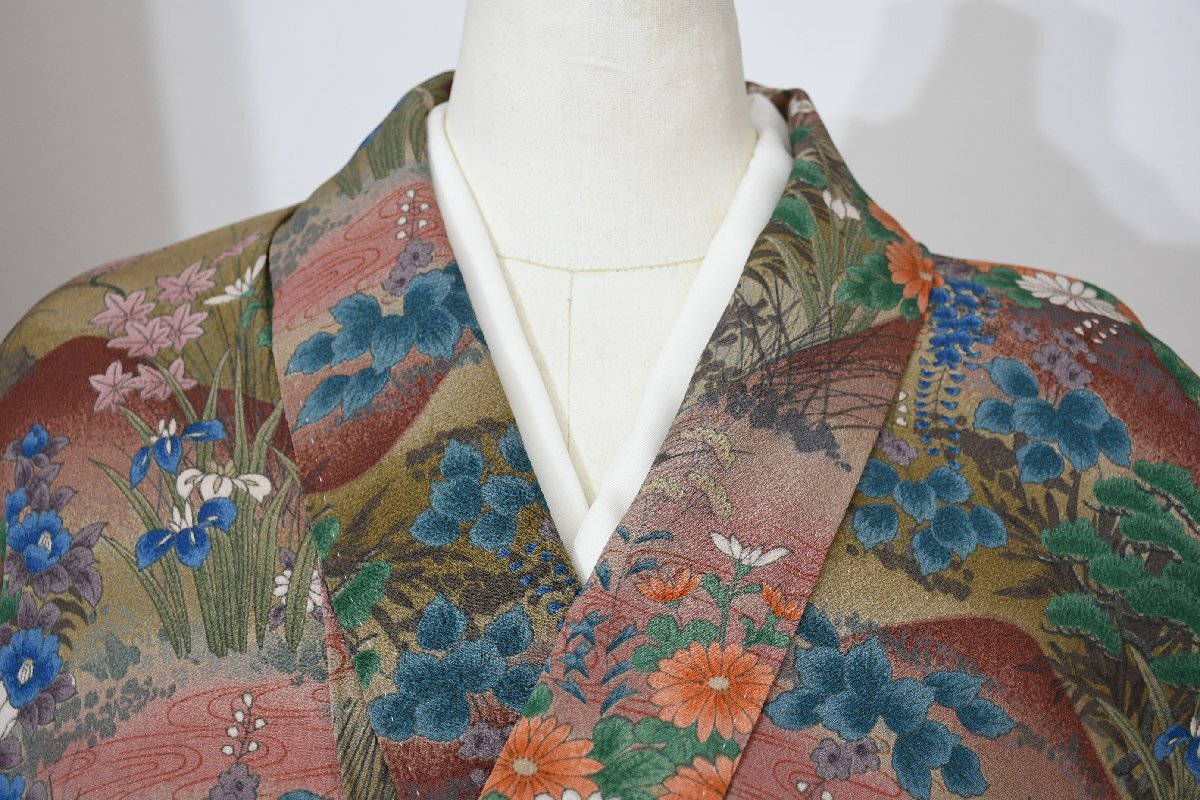 > 小紋 着物 袷 縮緬 花 身丈155cm 裄丈64cm ★ kb-6425 桜庭呉服店