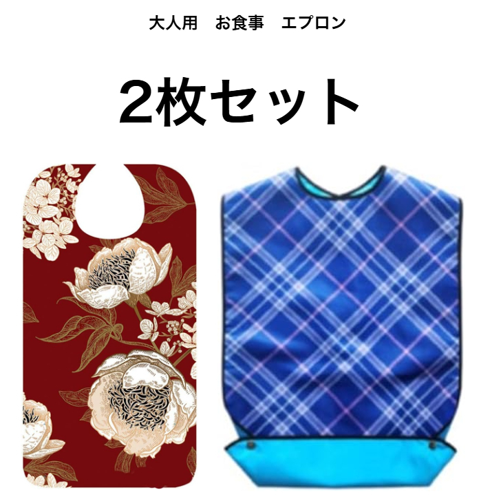 - 大人用介護 お食事 エプロン 2枚セット 新品送料無料 お花 &チェック 何度も使える