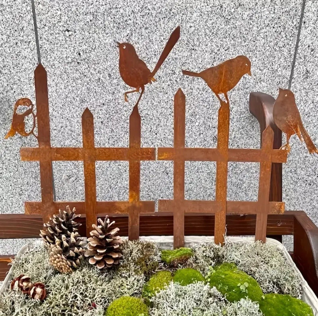 - ガーデン彫刻 錆る小鳥の柵 2点セット メタルバード HANAKO 鳥の雑貨