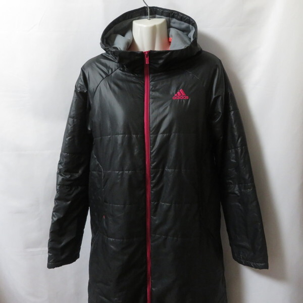 - 古着 レディースL adidas/アディダス 裏起毛 コート ジップ フード スポーツ 防寒 ブラック/ピンク F51214