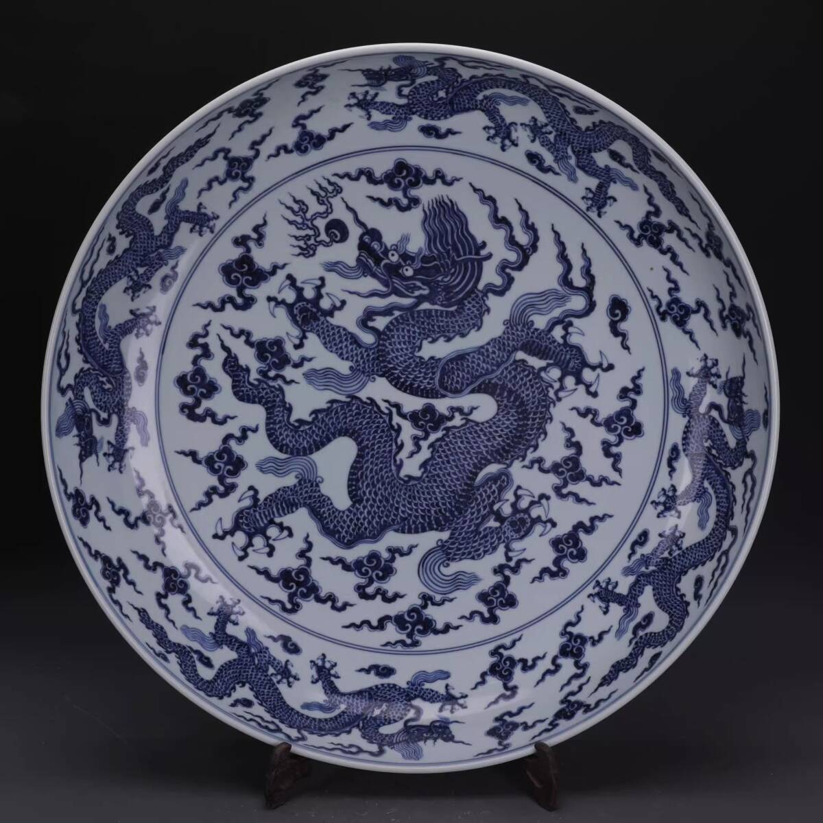- ◆旧家蔵出◆古美術 中国古玩 大明宣徳年製款 青花 九龍紋大盤 古賞物 擺件 骨董 時代物 CN01