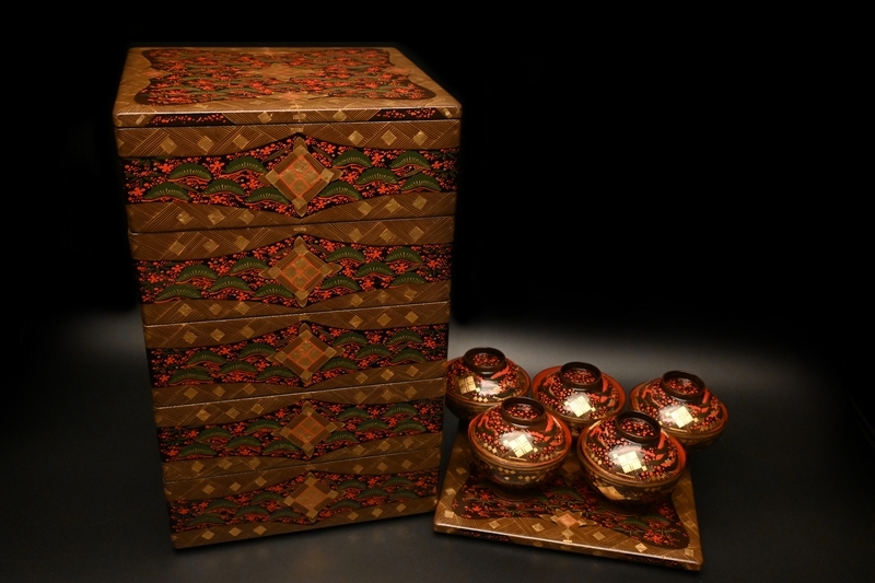 - 会津絵 重箱 小吸物椀揃 稀少■内朱塗縁蒔絵 五段重箱 椀 会津絵 蒔絵[松竹梅]■天然木 木製 蒔絵 金箔 時代漆器 骨董 古美術 木箱入■