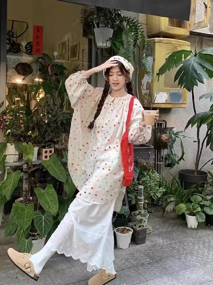 - OHJ964★ワンピース カラフルドット柄 大人可愛 ゆったり オシャレ フリーサイズ ナチュラル Aライン 綿麻混