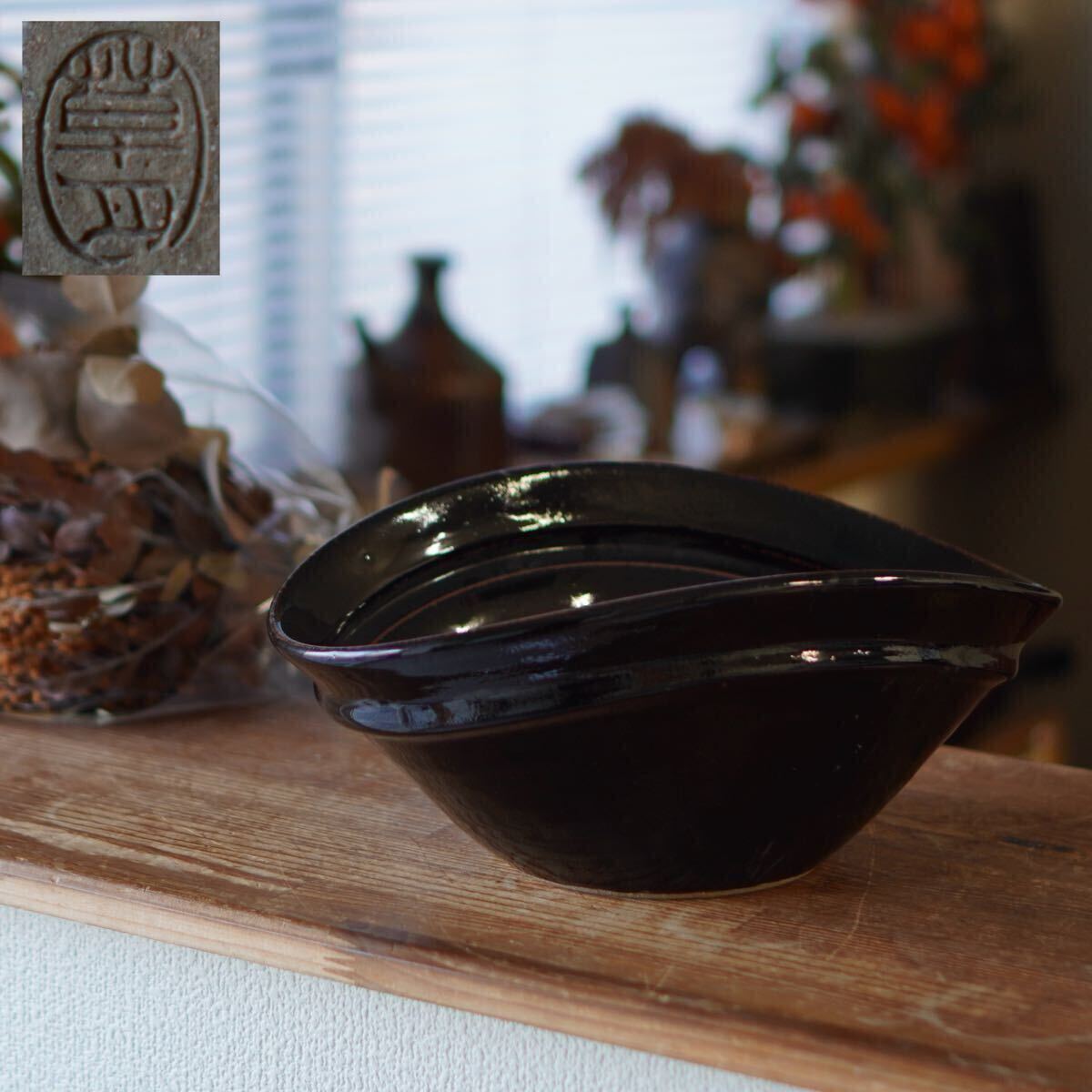- SNT071 陶器製 黒塗極点 花入 花器 在銘 作家物 珠玉