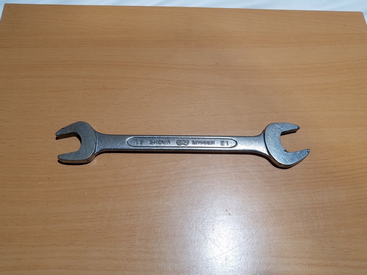 > 153-10 昭和スパナ ロング ダブルロゴ クロモリ JIS無し 19mm-21mm 凹丸パネル 中古品 昭和レトロ