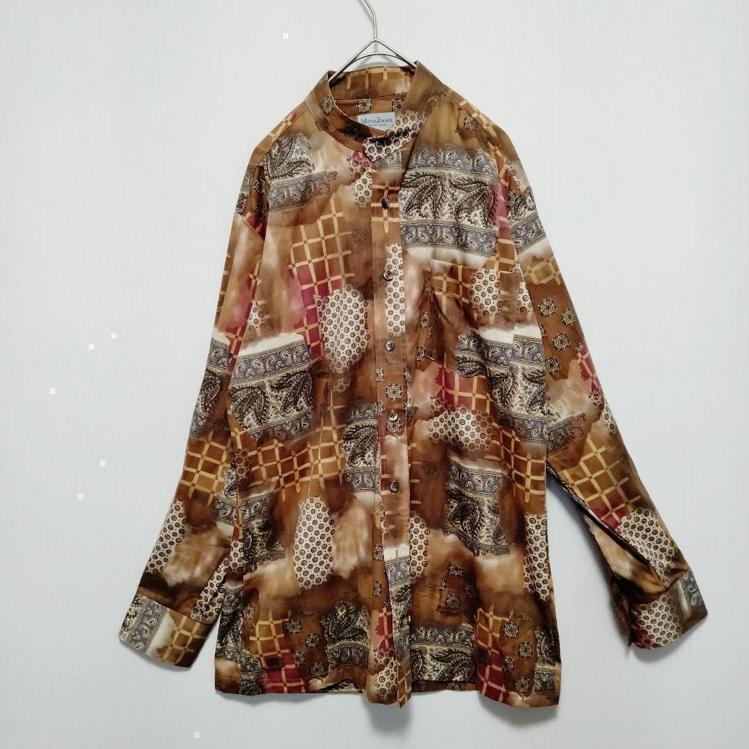 - 【大人気】総柄 ペイズリー柄 絵画柄 オーダーメイドシャツ バンドカラー ブラウン 綿100% 長袖 古着 メンズ
