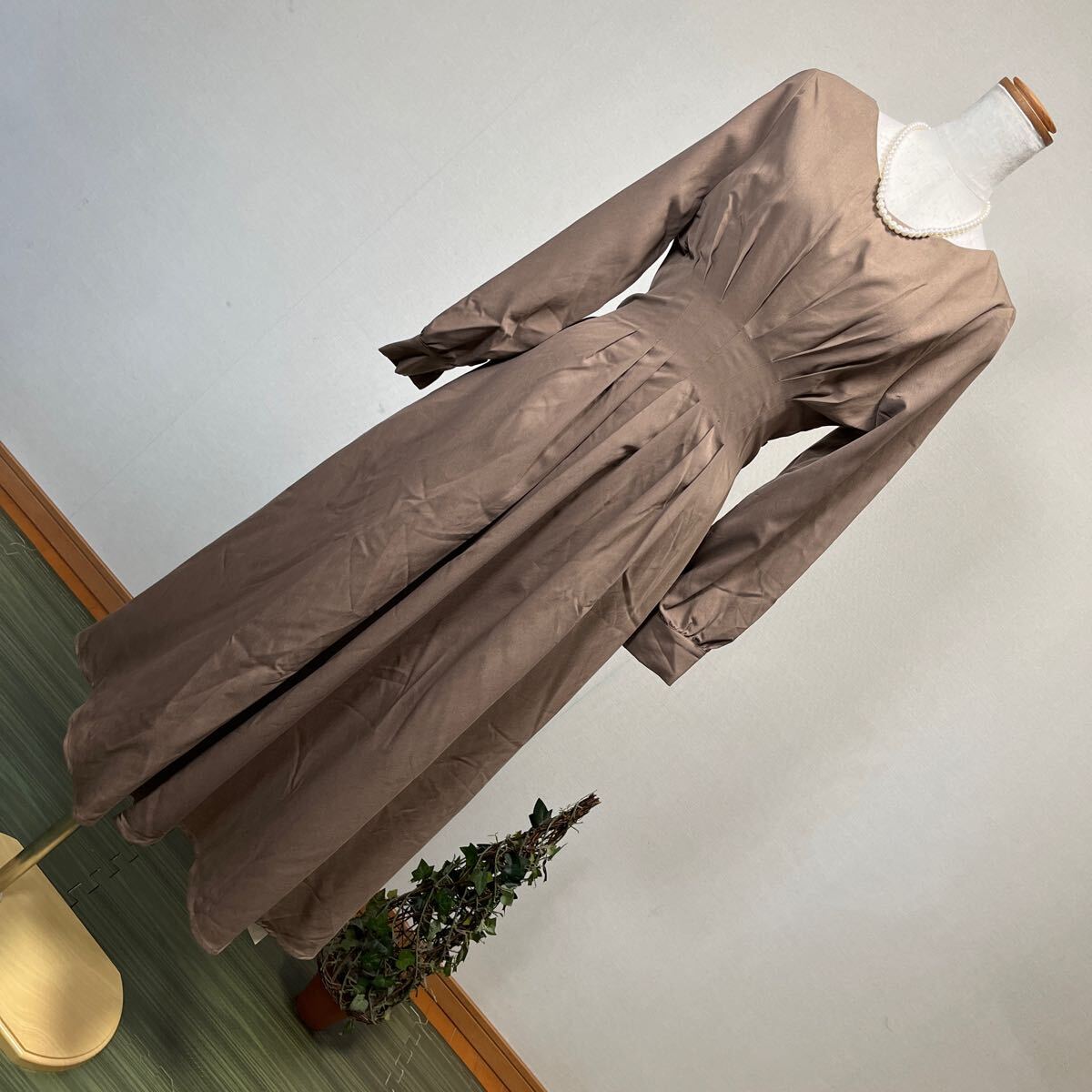 - 1-7新品 Vネック長袖シャツワンピース ロングフレアースカートタックワンピ バックシャーリング モカ 9号 M