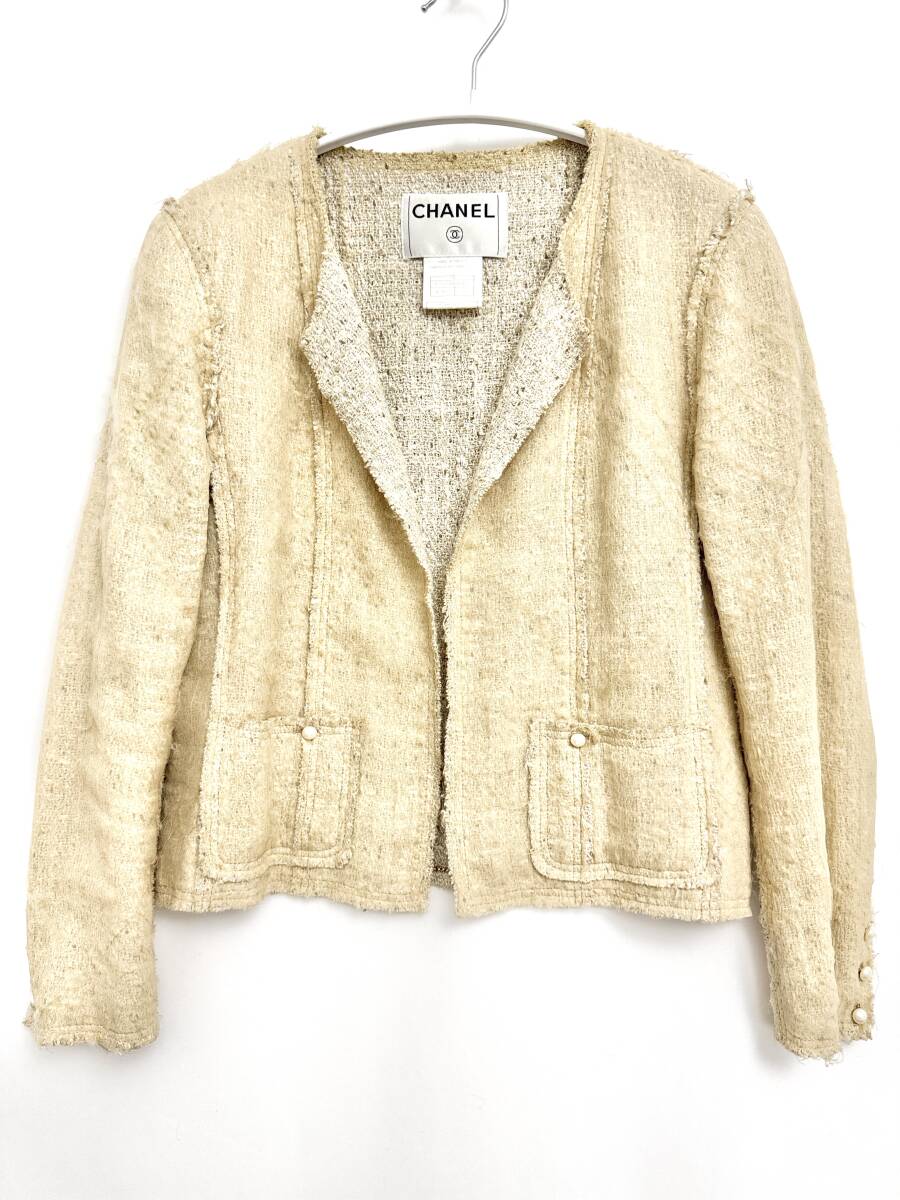 > 6L2214【本物保証】シャネル ノーカラー ジャケット ツイード ベージュ Fパール ココマーク ボタン #36 P21321 03P CHANEL