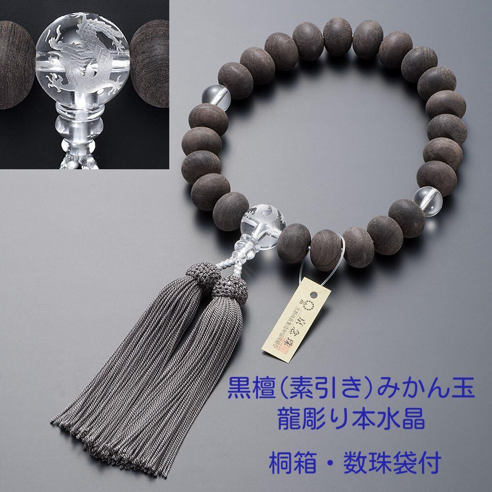 - 京念珠 数珠 男性用 黒檀(素引き)みかん玉 龍彫り本水晶 正絹房 数珠袋付 画像