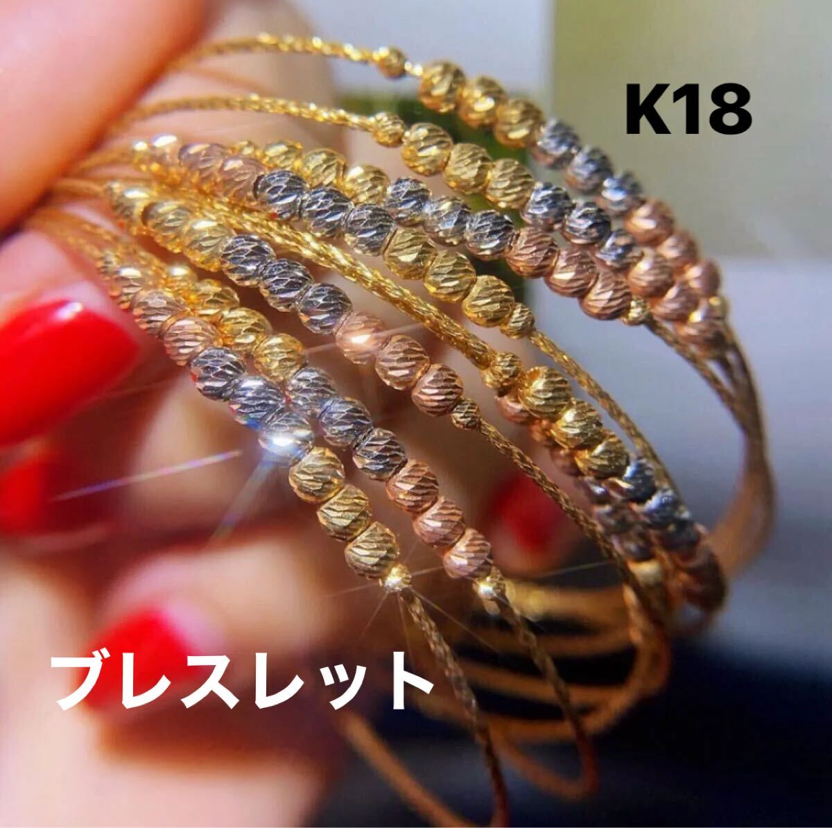 > K18金 ワイヤーブレスレット イエローゴールド キラキラ三色ボウル K18YG 刻印あり DA10