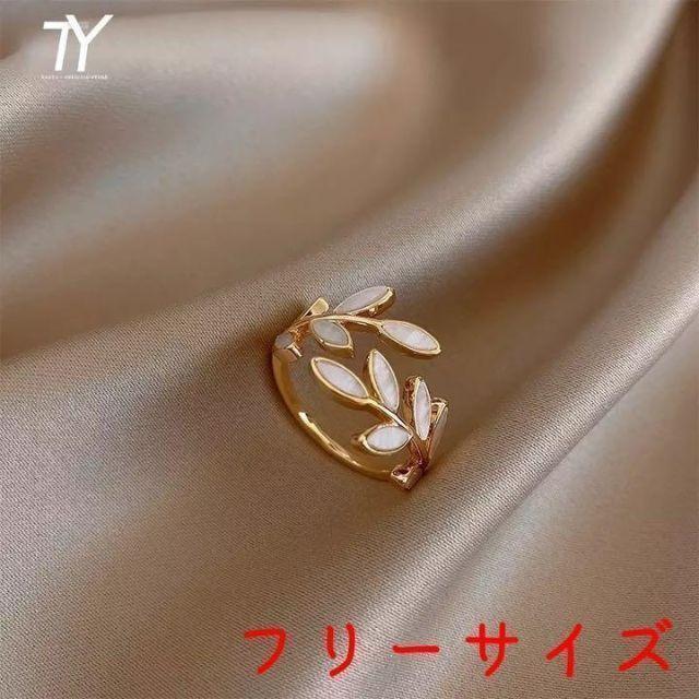 - リーフモチーフリング 指輪 ゴールド×ホワイト フリーサイズ オープンリング レディース 葉 アクセサリー 人気 韓国 新品