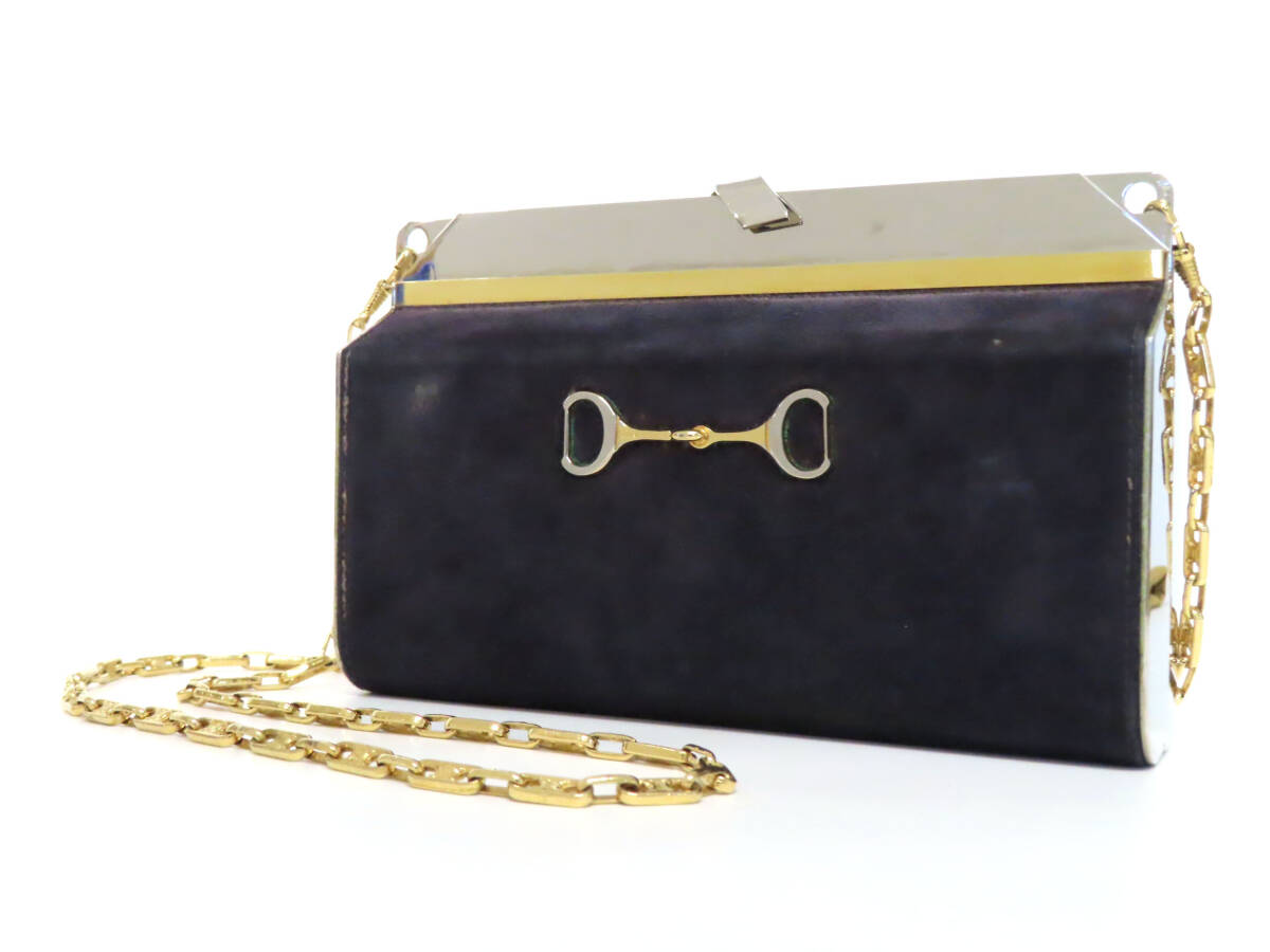 - 24952 美品 CELINE オールドセリーヌ ホースビット金具 スエードレザー×メタル がま口 ブラゾン ショルダーバッグ 紺系 伊製 ヴィンテージ
